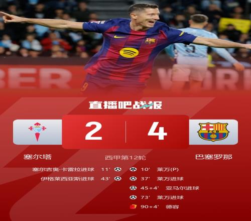 巴萨在联赛中收获两连胜以4比2战胜塞尔塔落后榜首仅差三分莱万首演戴帽亚马尔成功破门_西甲直播