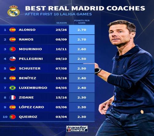 历任皇马主帅前10场西甲场均拿分榜