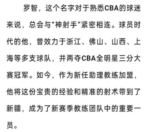 上赛季结束后,新疆男篮教练团队进行了一次大调整,除了保持主帅刘炜和老臣姜正秀,其他人都离队。在补充方面,本土教练有CBA名将罗智,经历了休赛期的考核之后,新疆男篮官方宣布罗智正式加盟球队,新赛季会负责刘炜,球队的目标是冲击前四。